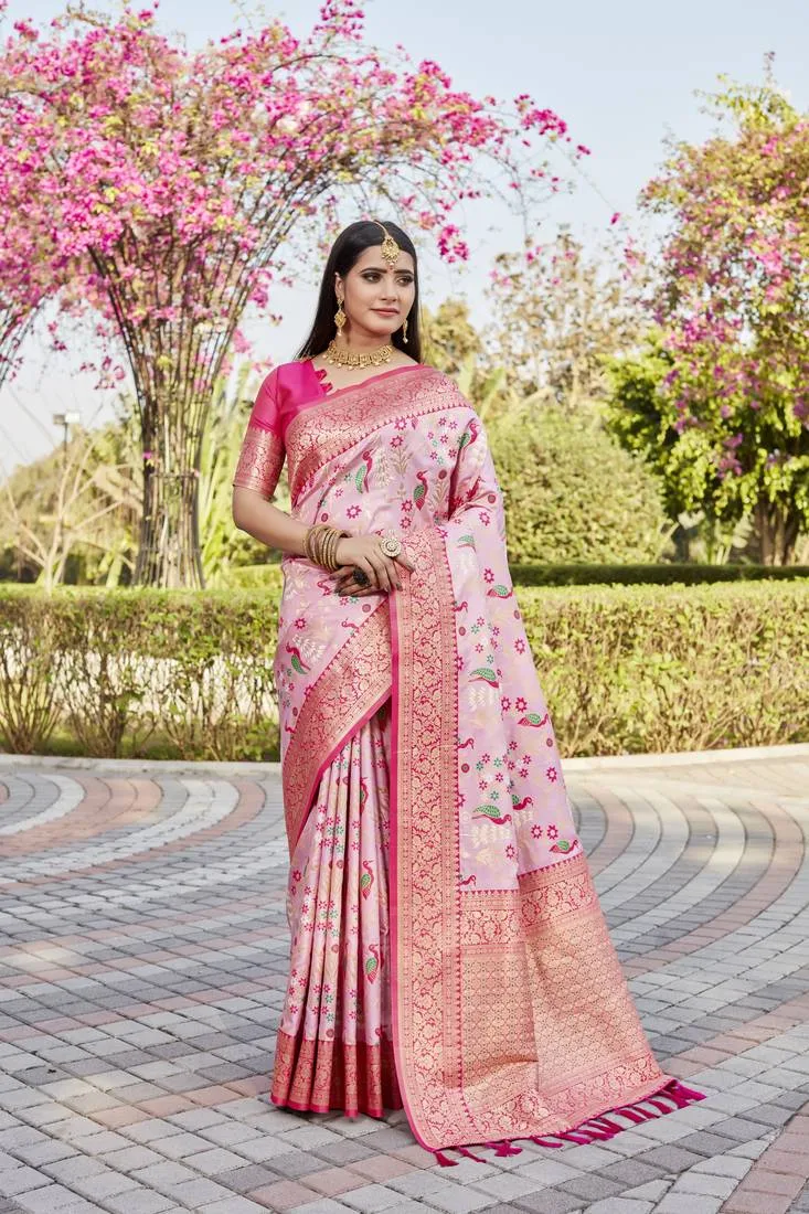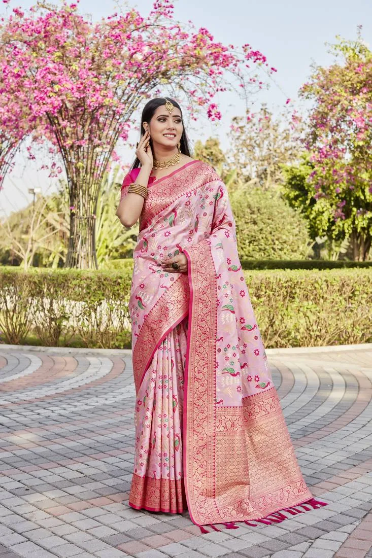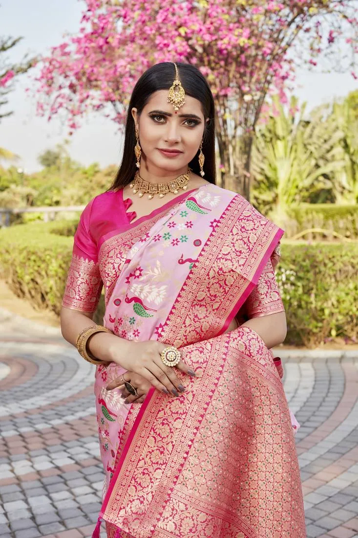 This exquisite saree is crafted from superior pure Original Pink Kanjivaram Silk Saree For Women, known for its luxurious shine and shimmer, adding a radiant glow to your look. The fabric feels lightweight and smooth, providing a sheer, delicate finish against the skin for ultimate comfort.