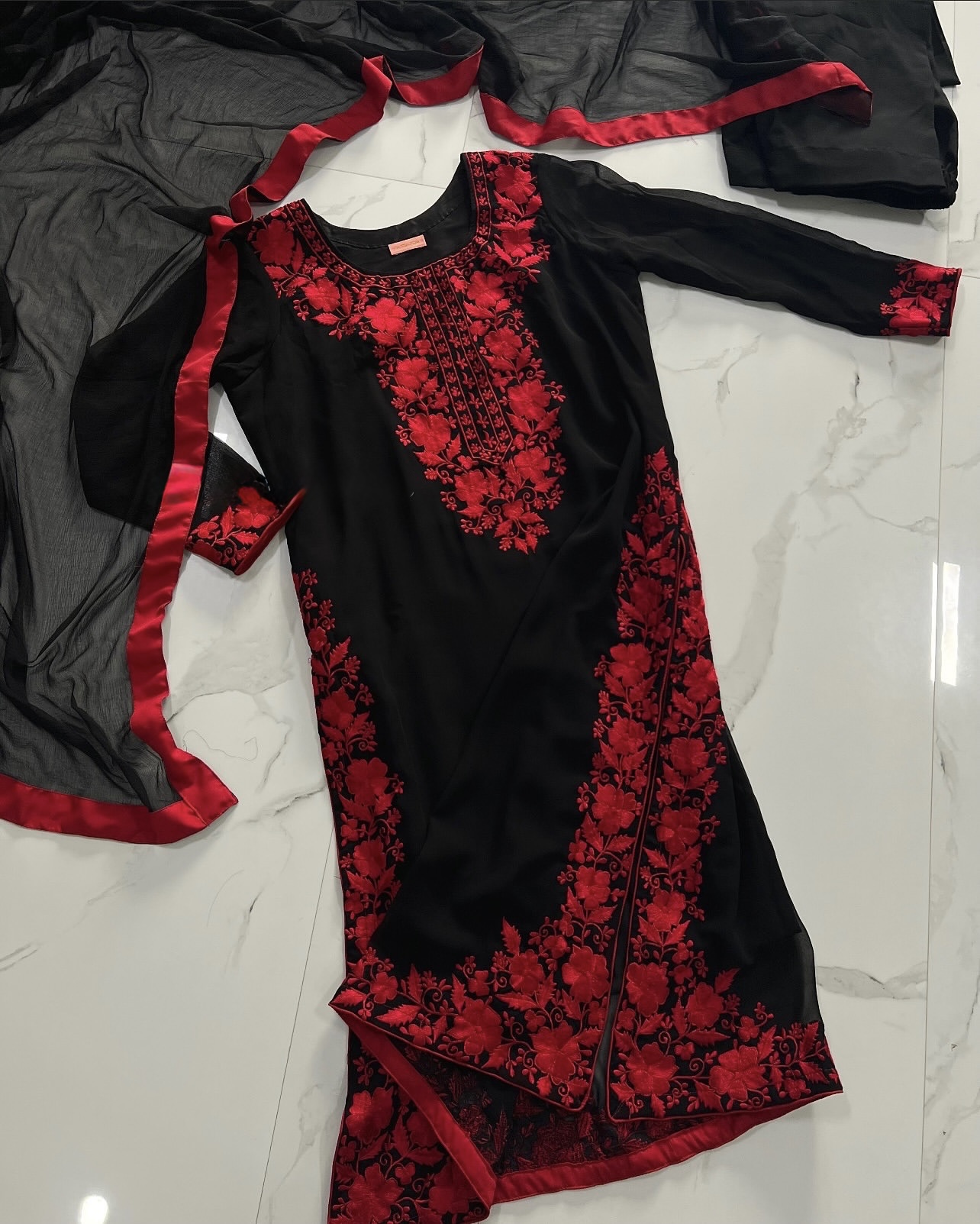 This designer women outfit is crafted using Heavy Faux Georgette, known for: