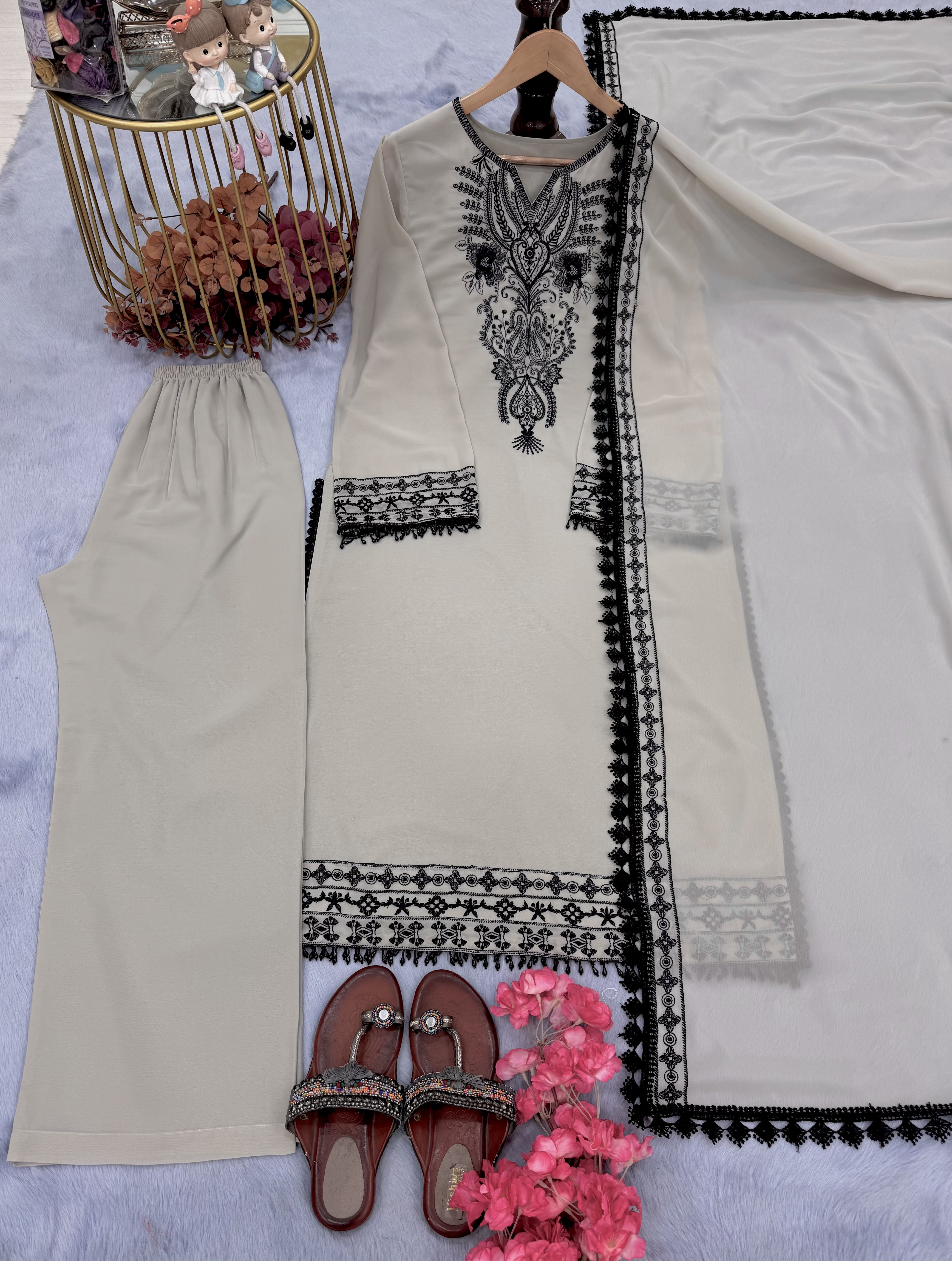 This designer top-bottom-dupatta set in heavy faux georgette is created for women who attend upscale social events, cocktail evenings, luxury weddings, festive celebrations, and private high-class gatherings.
